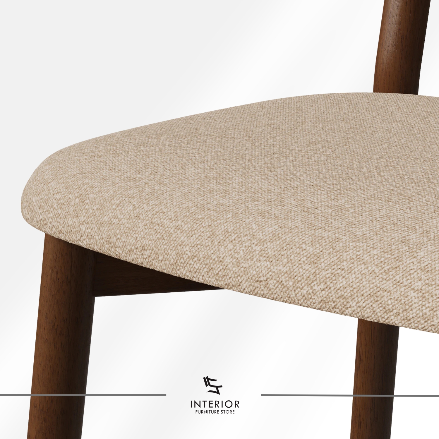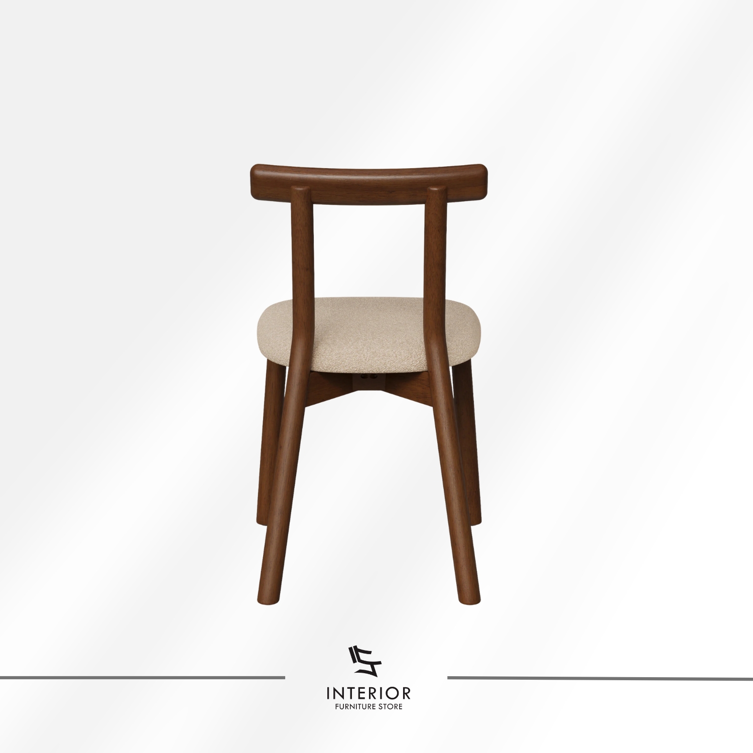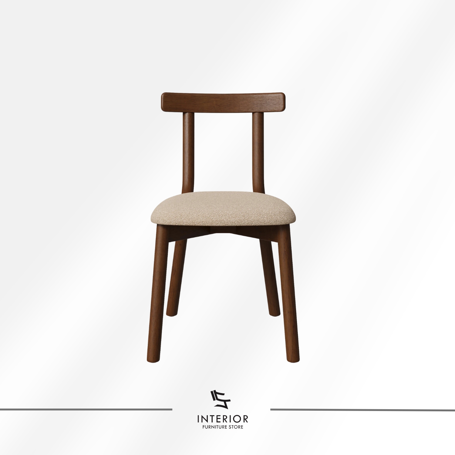 This wooden dining chair combines simplicity with refined craftsmanship. The solid wood frame features a warm natural finish that enhances the authentic wood grain and adds organic character to your dining space. The slightly angled back posts create visual balance while providing strong and stable support. A clean horizontal backrest offers ergonomic comfort and maintains a minimalist look. The padded seat features soft cushioning and textured fabric upholstery, ensuring comfortable seating for everyday dining. Rounded edges and well-balanced proportions give this dining chair a welcoming and elegant presence. Tapered legs strengthen the structure and maintain a light, modern silhouette. Perfect for Scandinavian, Japandi, modern, and contemporary dining interiors, this solid wood dining chair delivers durability, comfort, and timeless design in one versatile piece.