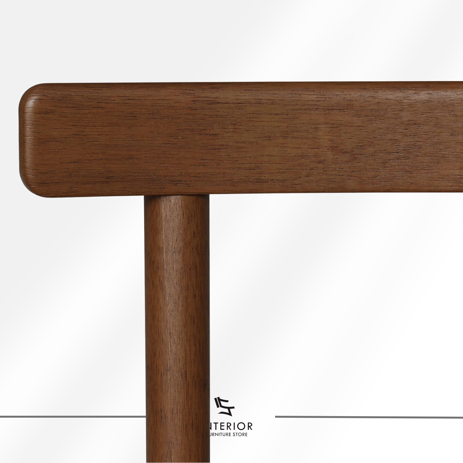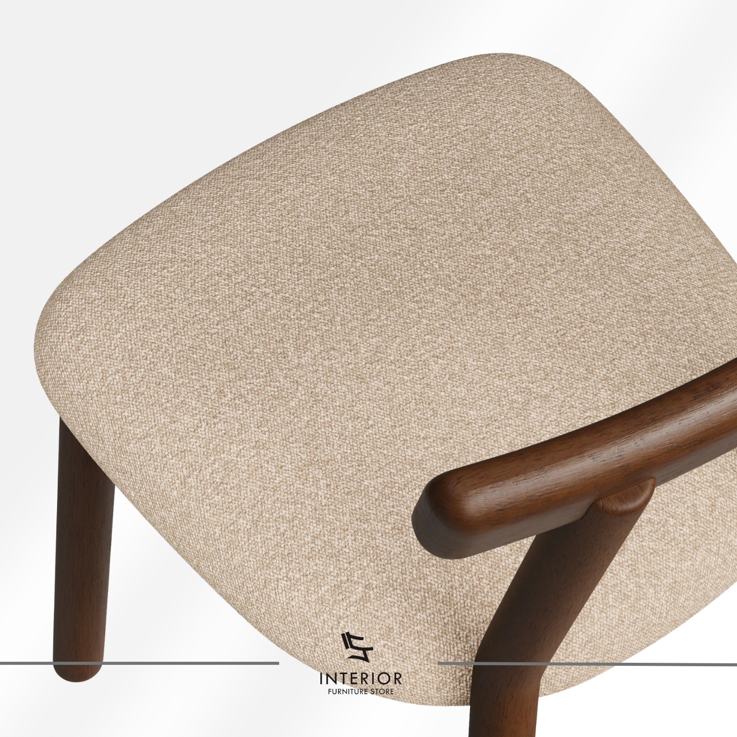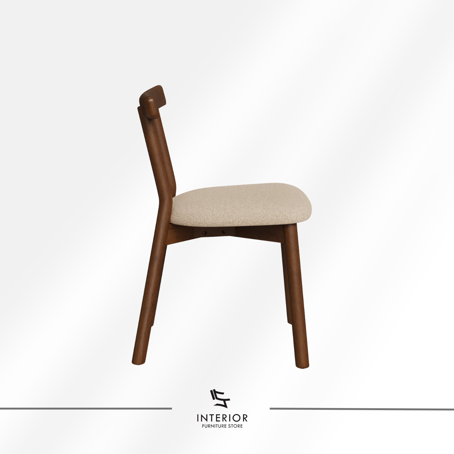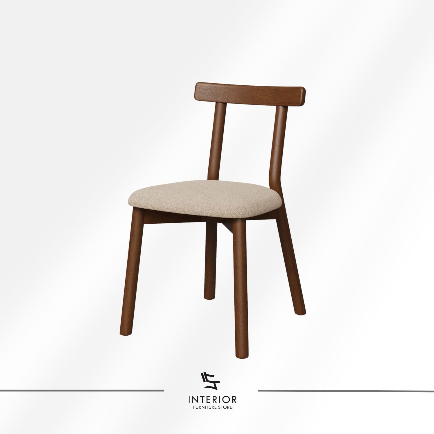 This wooden dining chair combines simplicity with refined craftsmanship. The solid wood frame features a warm natural finish that enhances the authentic wood grain and adds organic character to your dining space. The slightly angled back posts create visual balance while providing strong and stable support. A clean horizontal backrest offers ergonomic comfort and maintains a minimalist look. The padded seat features soft cushioning and textured fabric upholstery, ensuring comfortable seating for everyday dining. Rounded edges and well-balanced proportions give this dining chair a welcoming and elegant presence. Tapered legs strengthen the structure and maintain a light, modern silhouette. Perfect for Scandinavian, Japandi, modern, and contemporary dining interiors, this solid wood dining chair delivers durability, comfort, and timeless design in one versatile piece.