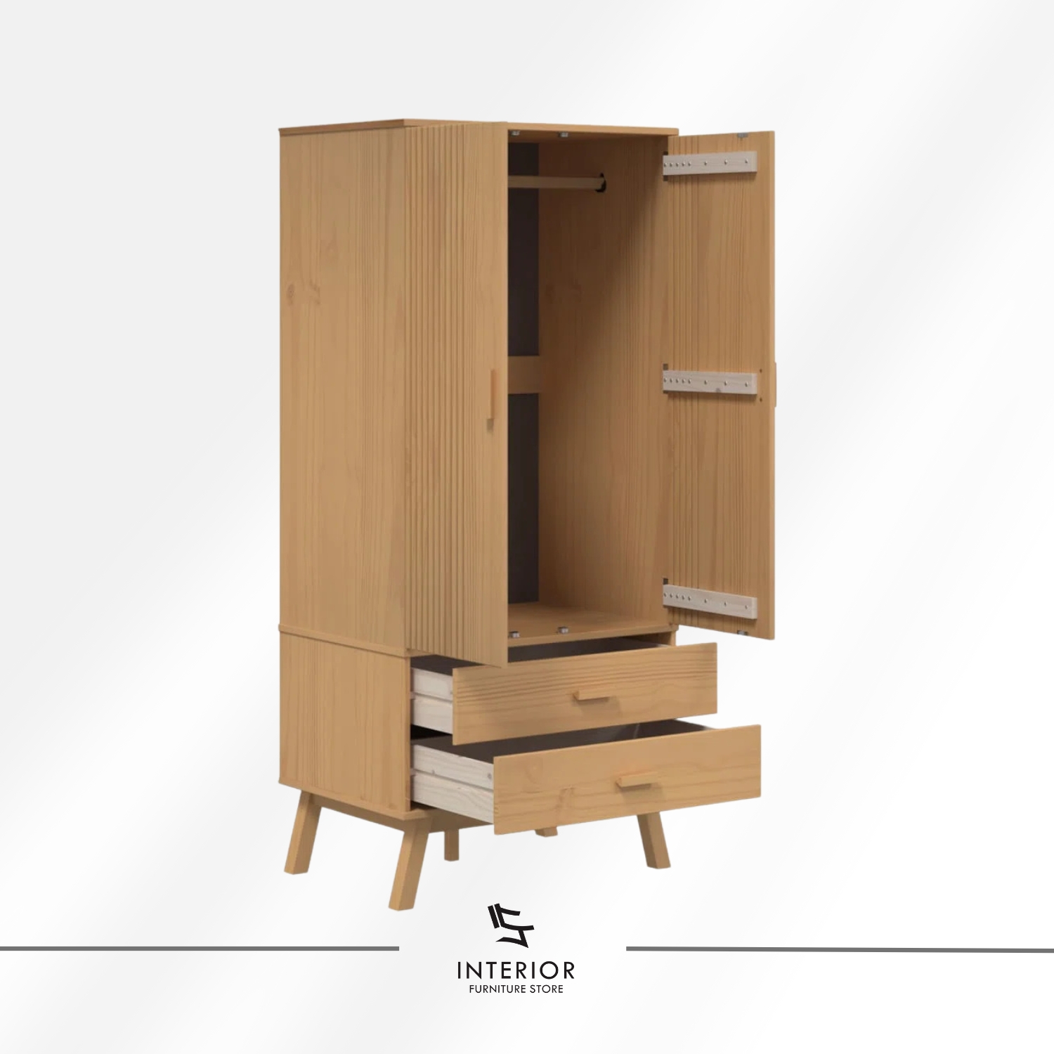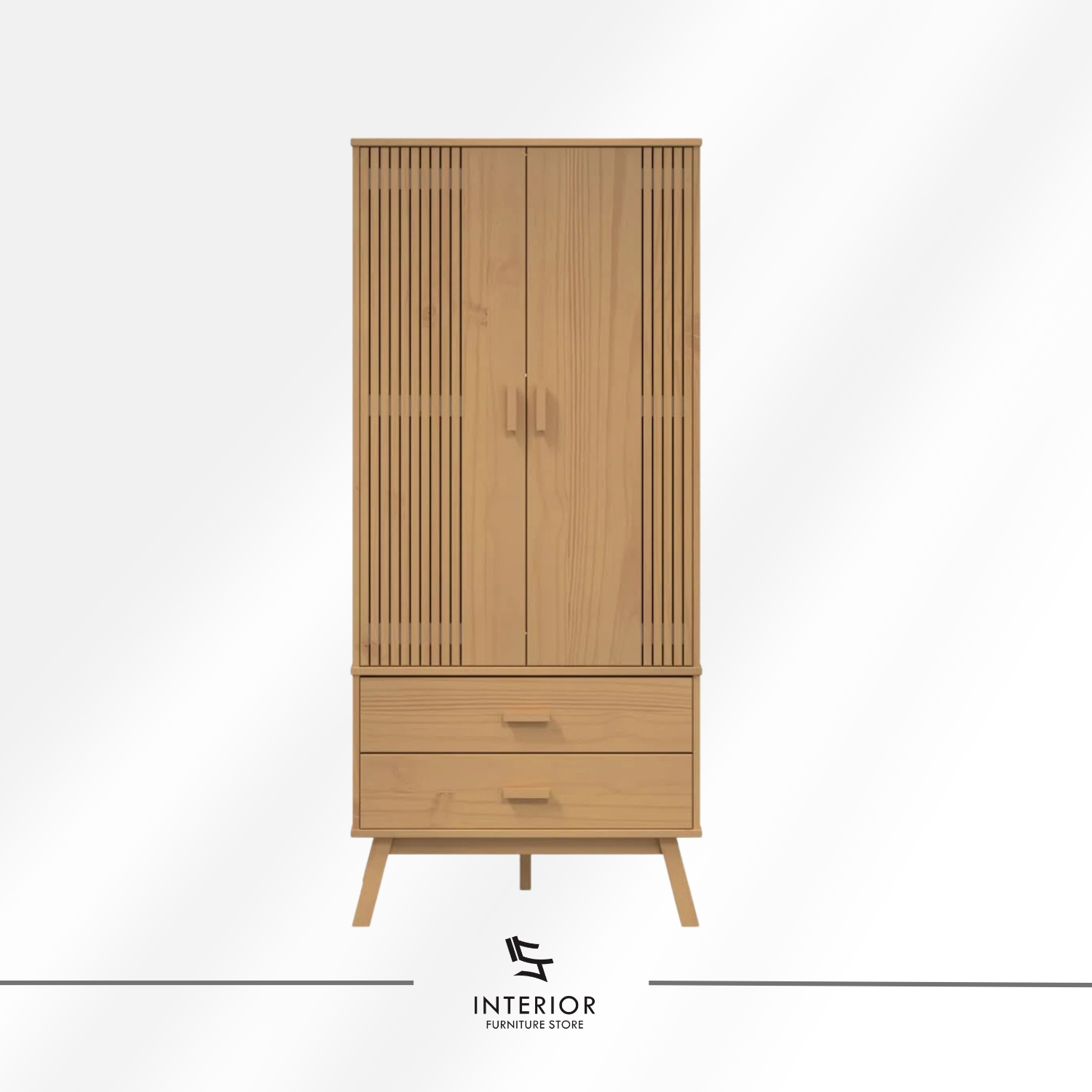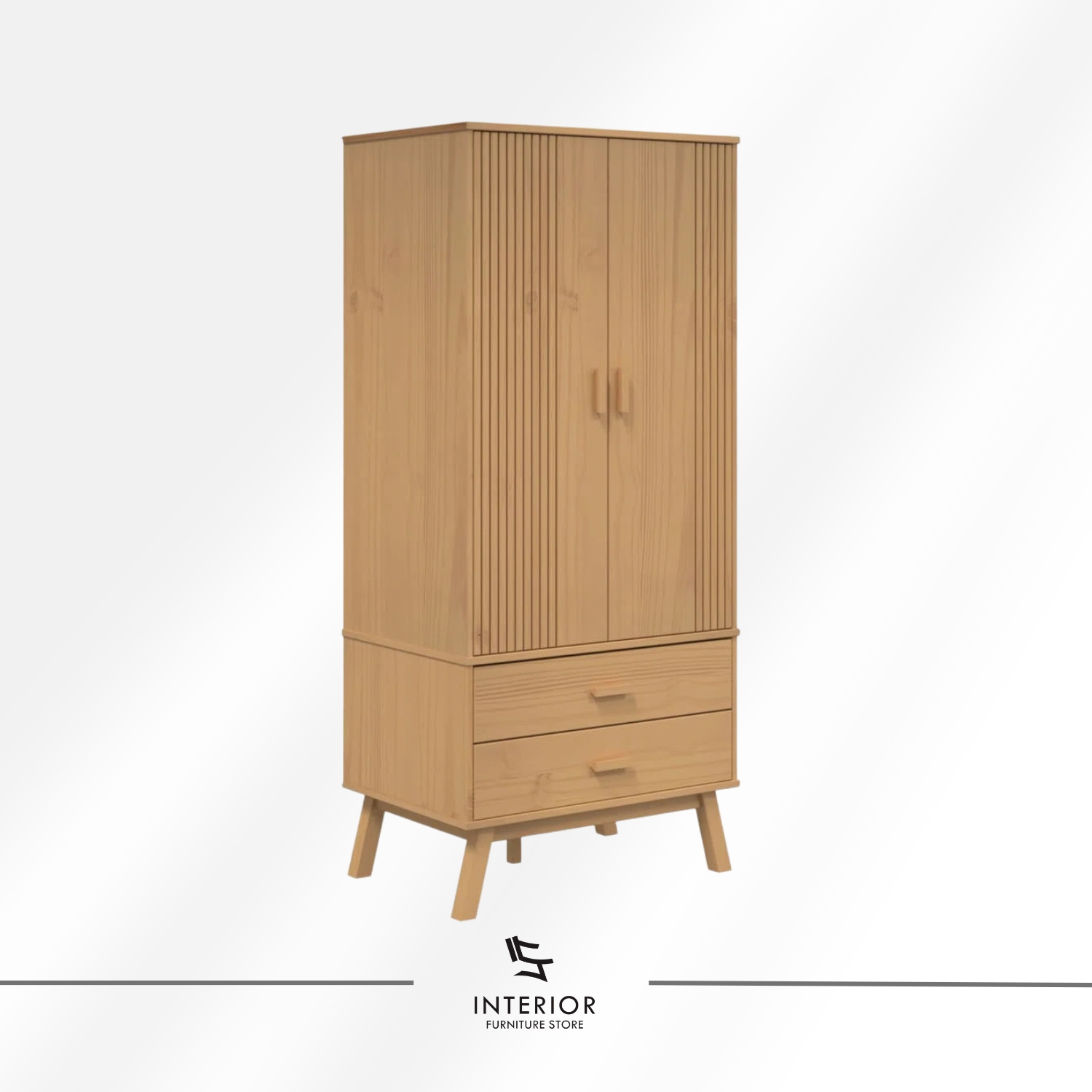 This Scandinavian-style wardrobe showcases a clean, functional design with a warm natural wood finish that brings lightness and balance to the room. Vertical slatted details on the doors add subtle texture and visual rhythm, while maintaining a calm, minimalist appearance. The upper cabinet offers practical hanging and shelving storage, complemented by lower drawers that provide additional space for folded clothing and essentials. Elevated on gently tapered wooden legs, the wardrobe feels light and well-proportioned, enhancing airflow and visual openness. Blending simplicity, craftsmanship, and everyday functionality, this wardrobe is ideal for modern Scandinavian, Japandi, and contemporary interiors.