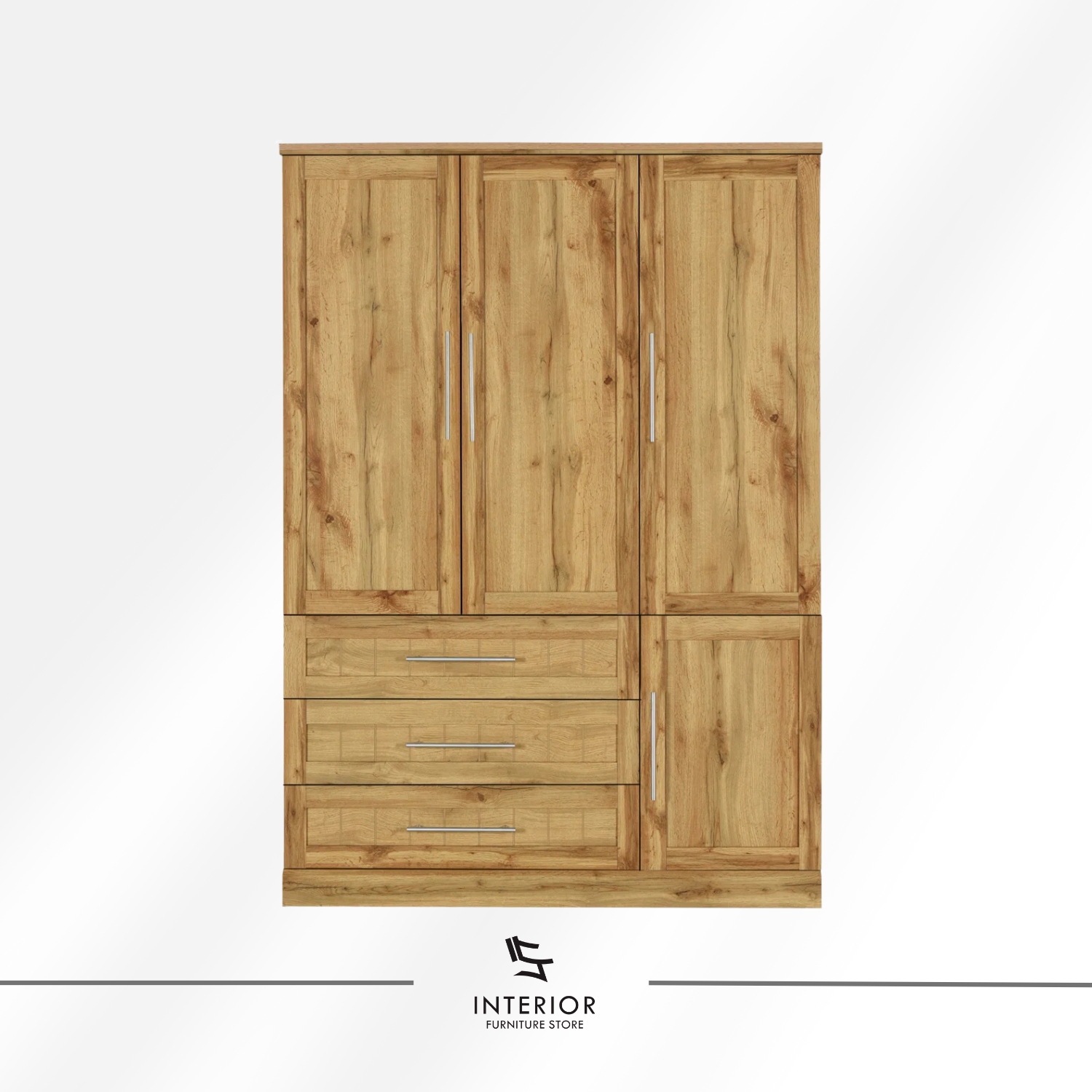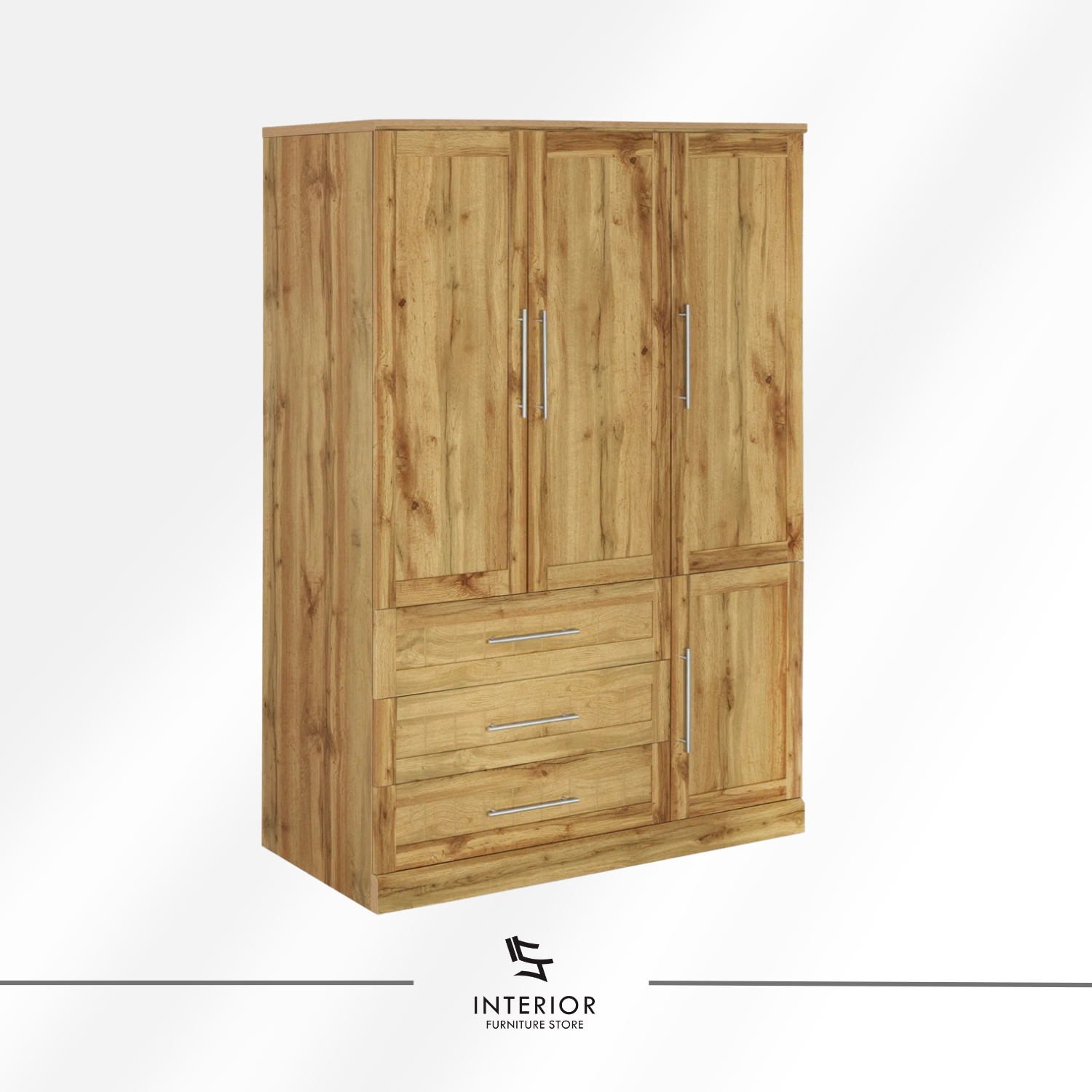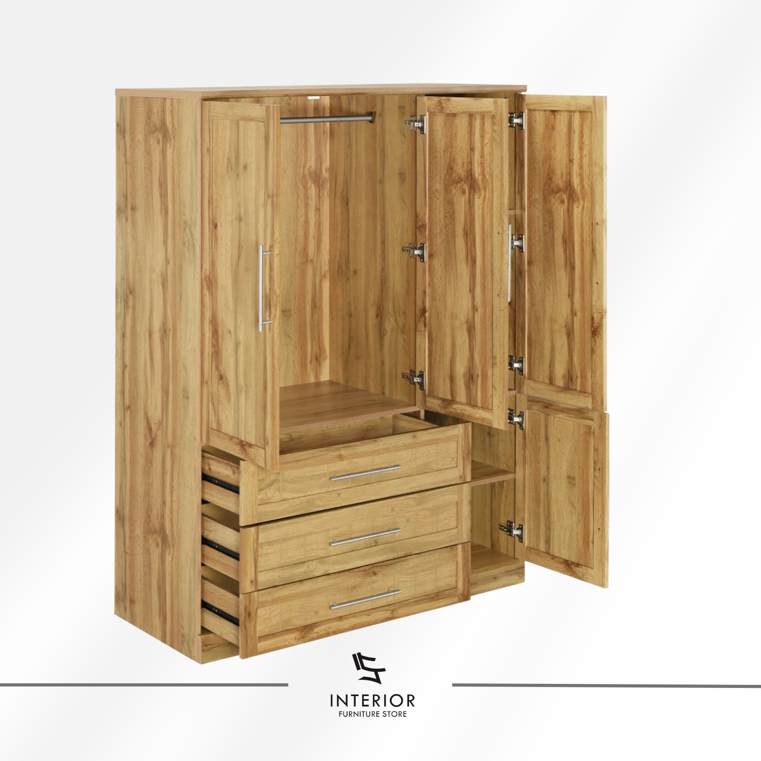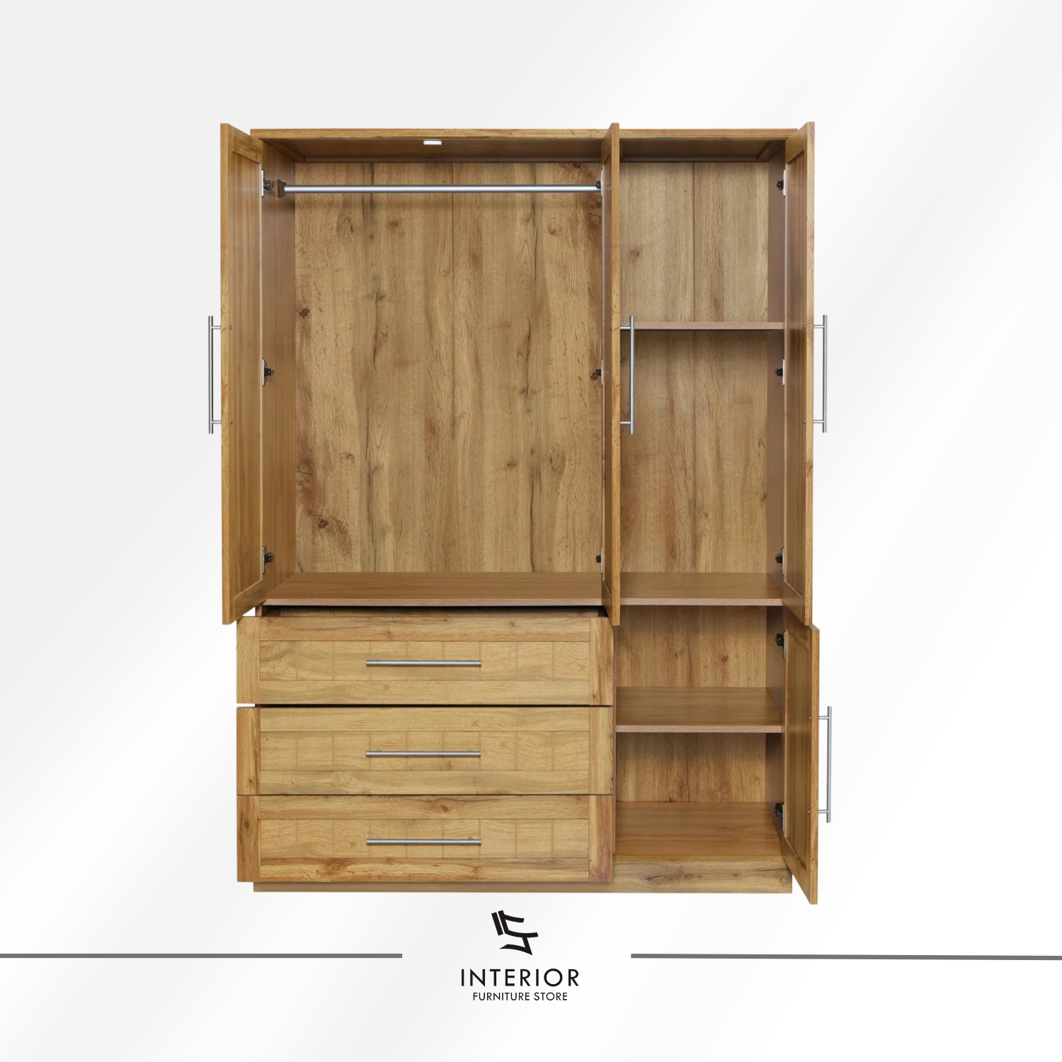 This wooden wardrobe showcases a timeless natural wood finish with a strong, well proportioned silhouette that brings warmth and character to the bedroom. Designed with multiple doors and spacious lower drawers, it offers versatile storage for hanging garments, folded clothing, and everyday essentials in one organized unit. The visible wood grain adds an organic, handcrafted feel, while sleek metal handles introduce a subtle modern touch that keeps the look clean and balanced. Built for both durability and visual appeal, this wardrobe blends traditional craftsmanship with modern functionality, making it an ideal choice for contemporary, rustic, and transitional interior styles.