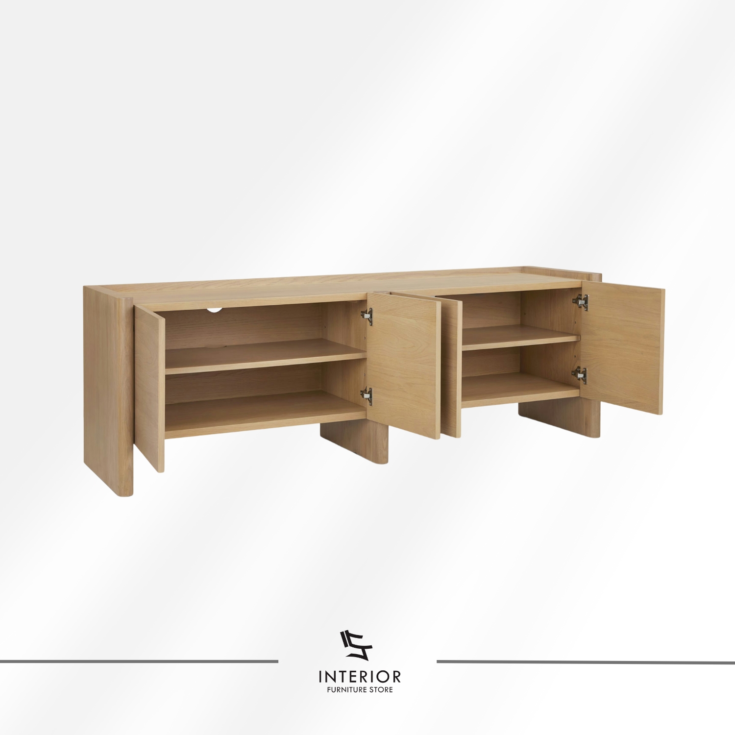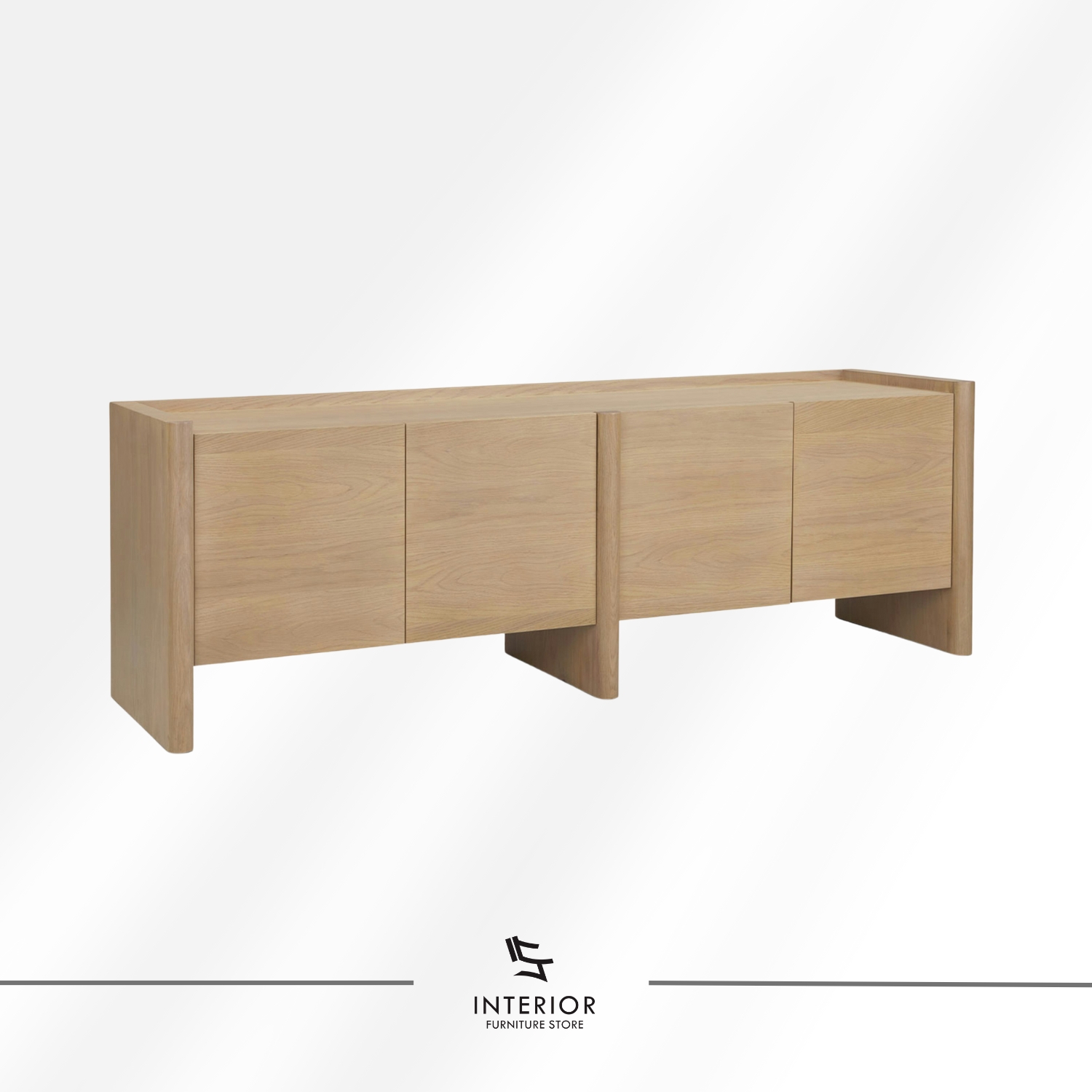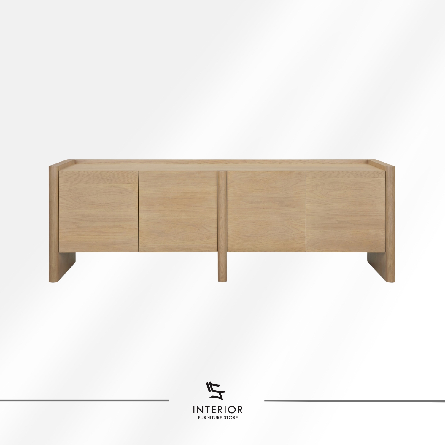 A minimalist wooden console cabinet designed with clean lines and a seamless natural oak finish that highlights the beauty of the wood grain. This modern console cabinet features concealed storage behind smooth panel doors, creating a sleek and uncluttered appearance while offering generous space for organization. The solid block-style legs and balanced proportions give the piece a sculptural presence, combining strength with understated elegance. Perfect as a wooden sideboard, TV console, or hallway cabinet, this piece blends effortlessly into Scandinavian, modern, and contemporary interiors, adding warmth, simplicity, and timeless craftsmanship to any space.