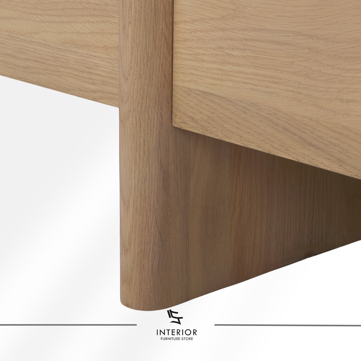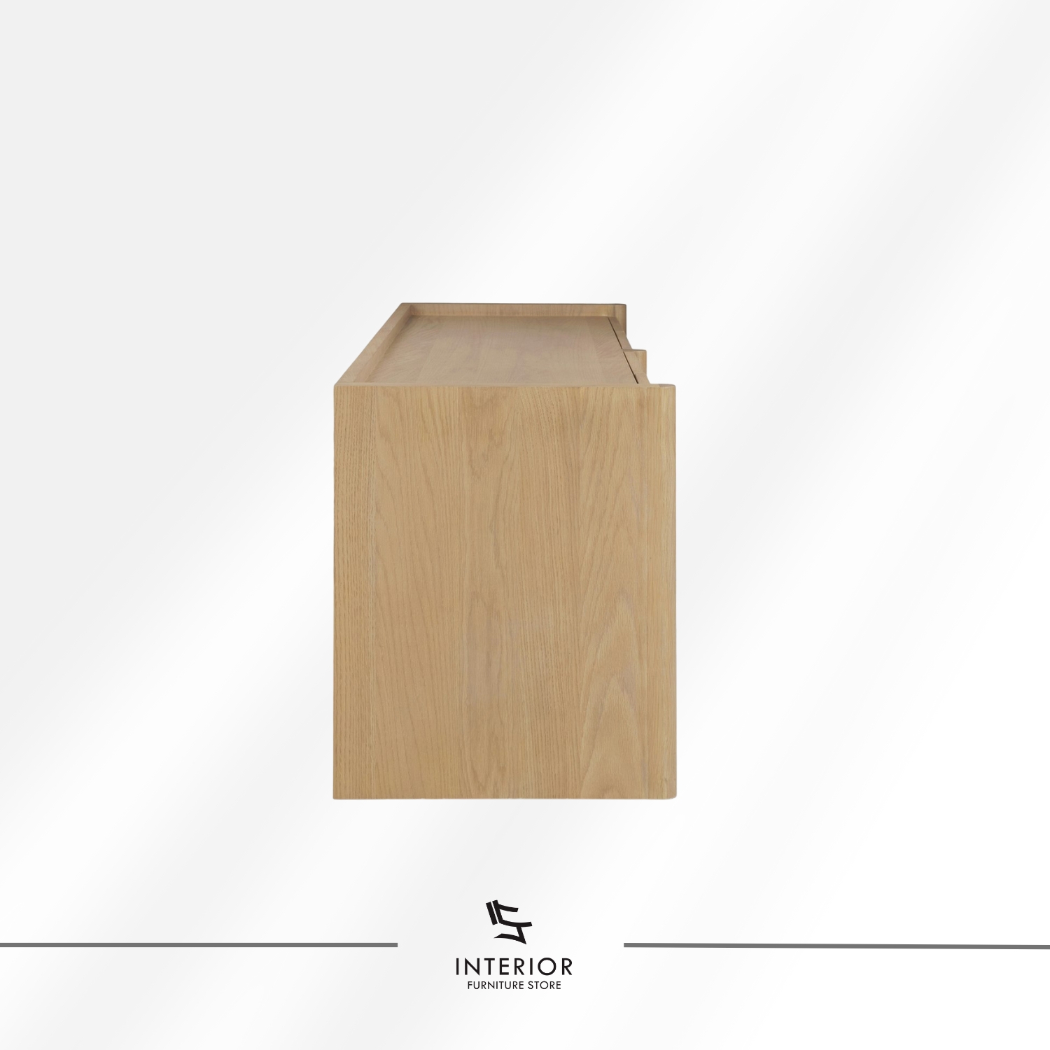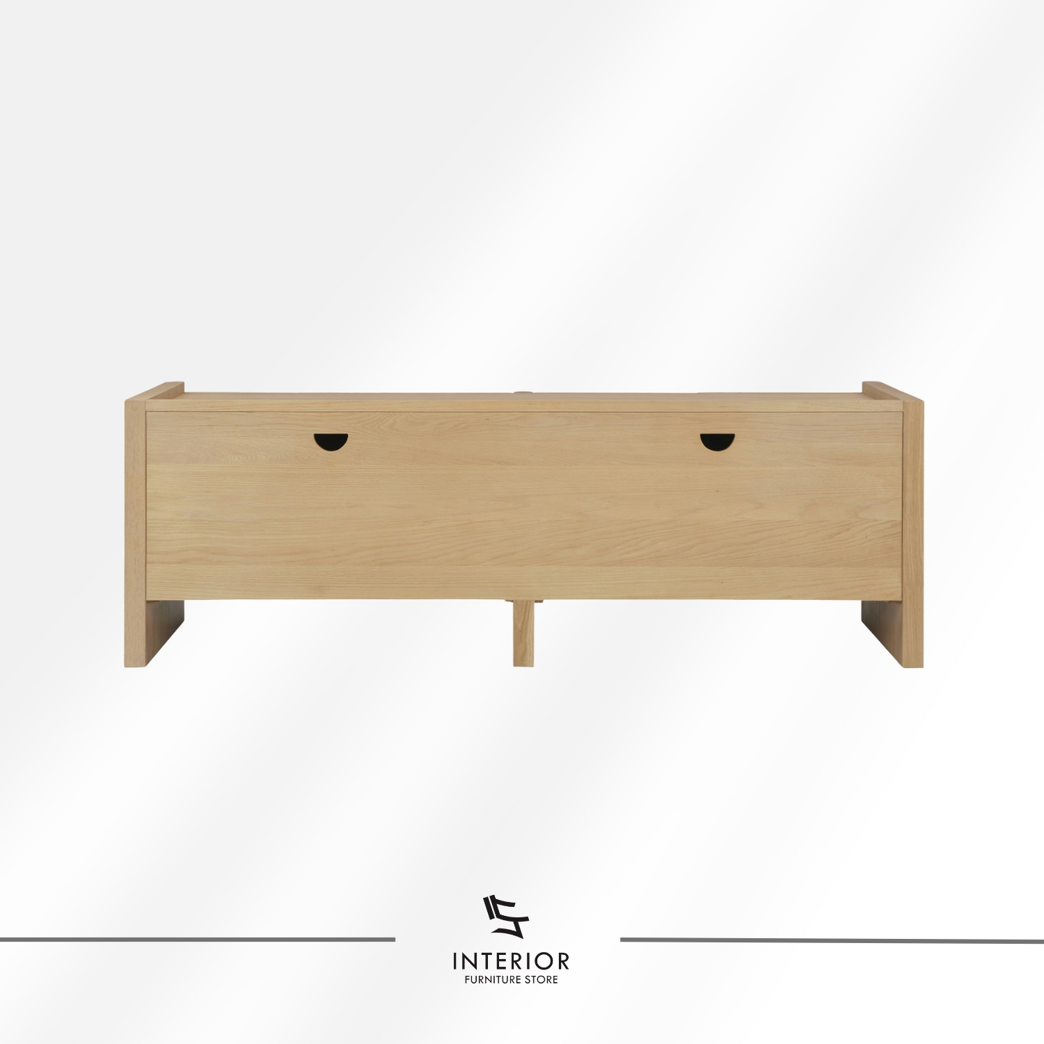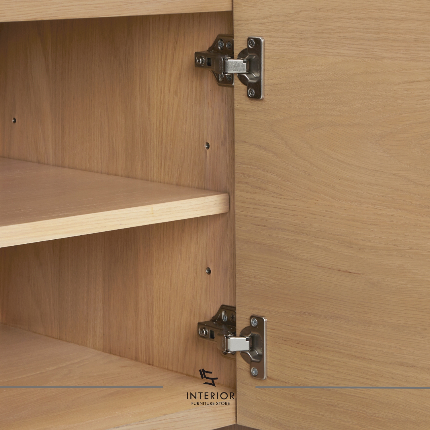 A minimalist wooden console cabinet designed with clean lines and a seamless natural oak finish that highlights the beauty of the wood grain. This modern console cabinet features concealed storage behind smooth panel doors, creating a sleek and uncluttered appearance while offering generous space for organization. The solid block-style legs and balanced proportions give the piece a sculptural presence, combining strength with understated elegance. Perfect as a wooden sideboard, TV console, or hallway cabinet, this piece blends effortlessly into Scandinavian, modern, and contemporary interiors, adding warmth, simplicity, and timeless craftsmanship to any space.